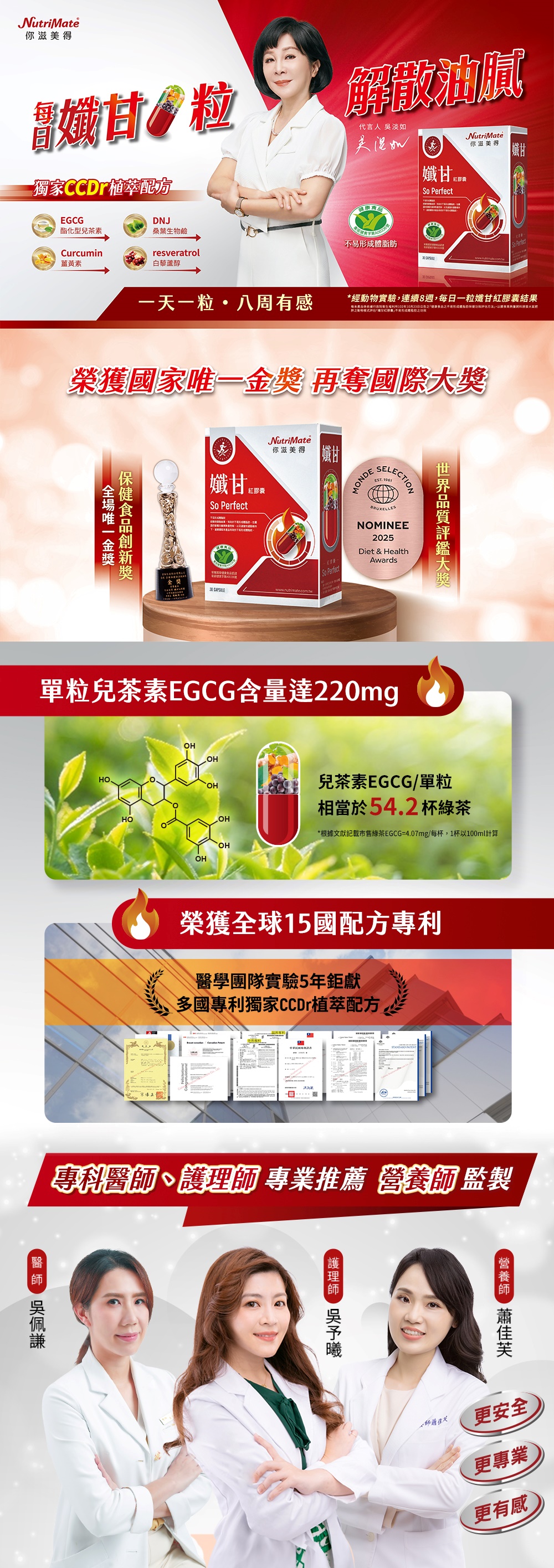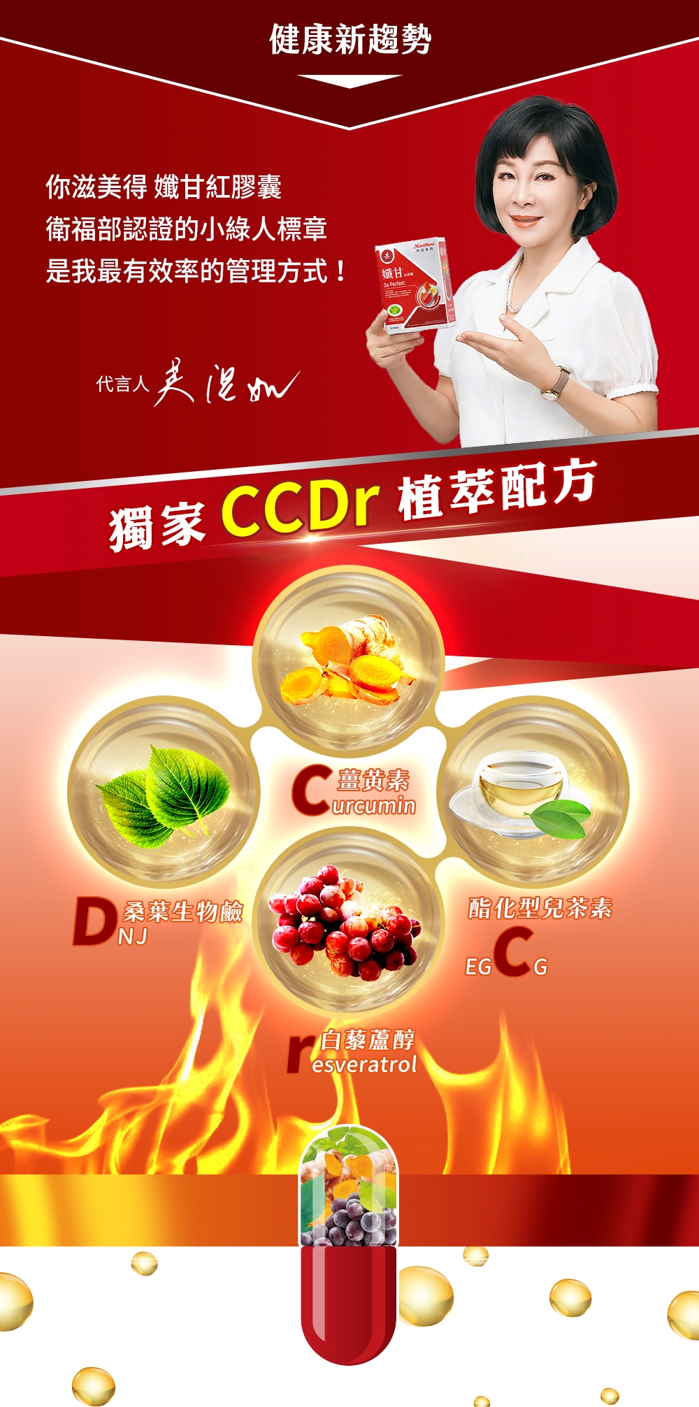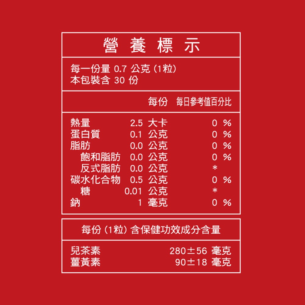 內容物:綠茶萃取物、薑黃萃取物、桑葉萃取物、葡萄皮萃取物、硬脂酸鎂 膠囊殼:明膠、二氧化鈦、食用紅色六號、食用黃色四號、硫酸月桂酯鈉、食用藍色一號、純水